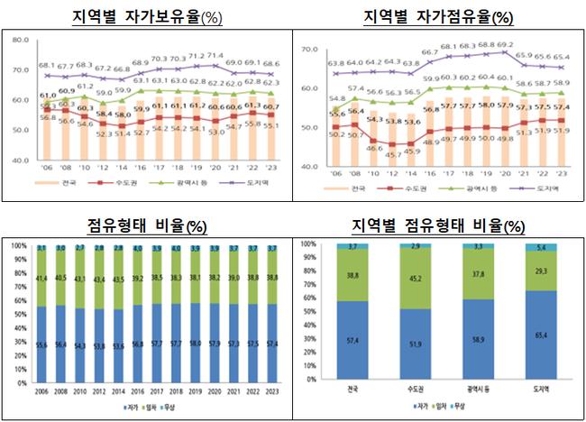 이번 조사에 따르면 전국의 자가보유율은 60.7%로 전년(61.3%) 대비 0.6%p 감소했다. 지역별로는 도지역(68.6%), 광역시 등(62.3%), 수도권(55.1%) 순으로 높게 나타났다.