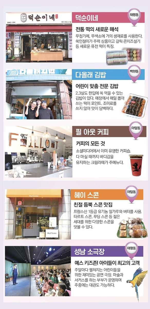 최종 선발된 힙스토어 5개 점포는 ▲다올래김밥(어린이 맞춤 전문 김밥, 분당구 판교역로) ▲덕순이네(전통떡에 대한 새로운 해석, 수정구 수정북로) ▲성남소극장(예스 키즈존, 아이들이 최고의 고객, 수정구 수정로) ▲필아웃커피(커피의 모든 것, 분당구 벌말로) ▲헤이스콘(친절 듬뿍 스콘 맛집, 분당구 야탑로)이다.