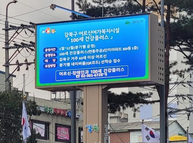서울 강북구(구청장 이순희)는 소상공인들에게 홍보 기회를 제공하고 구정 홍보를 강화하기 위해 전자게시대를 설치하고, 지난 12월 28일(토)부터 내년 1월 31일(금)까지 시범 운영한다고 밝혔다.