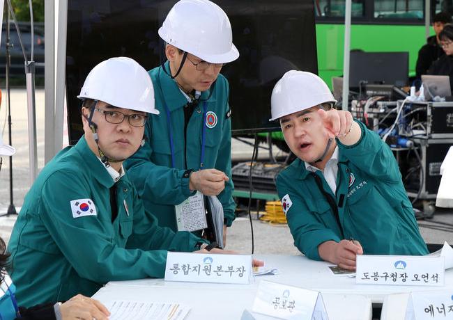 오언석 도봉구청장이 2024 재난대응 안전한국훈련(현장 훈련)에서 상황 발생에 따른 지시를 내리고 있다(2024. 10. 25. 도봉공영차고지)(사진 오른쪽에서 첫 번째 오언석 도봉구청장)