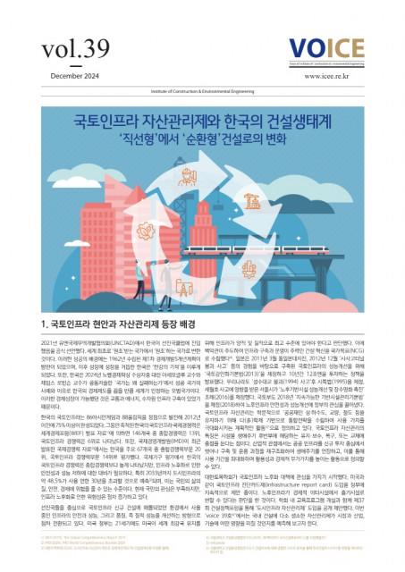 VOICE는 건설산업 이슈에 대한 전문가의 냉철한 시각과 분석을 통해 한국건설이 나아가야 할 바람직한 방향을 제시하는 건설환경종합연구소의 발간물이다.