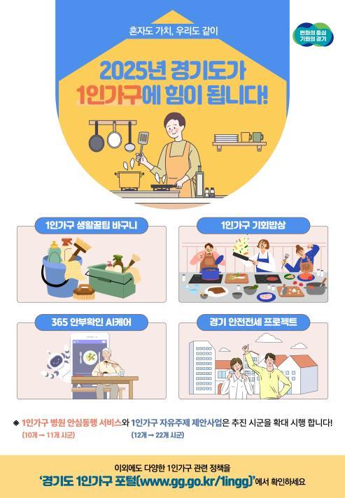 그 밖에 `365 안부확인 AI케어`, `경기 안전전세 프로젝트` 등 1인가구에게 필요한 분야별 정책들이 포함됐으며, 이 같은 사업들에 대한 인지도를 높이기 위해 찾아가는 정책 홍보를 강화해 나갈 계획이다.