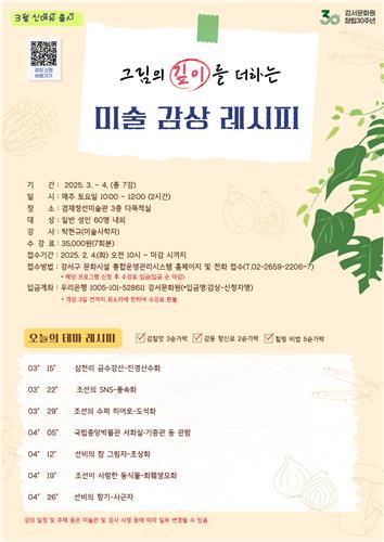 강좌는 오는 3월부터 4월까지 매주 토요일 오전 10시에 시작해 2시간씩 총 7회 진행된다. 신청은 겸재정선미술관 누리집(culture.gangseo.seoul.kr)이나 전화로 하면 된다. 수강료는 35,000원이다.