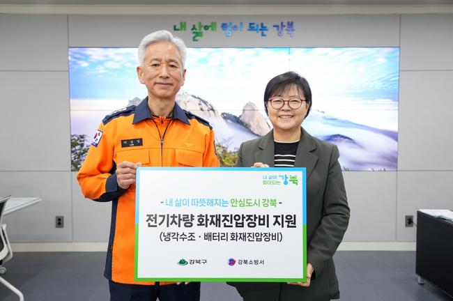 이와 관련해 구는 지난 2월 5일 강북구청 구청장실에서 전기차 화재진압장비 전달식을 개최했다. 이날 이순희 강북구청장과 강북소방서장 등이 참석해 구민 안전을 주제로 의견을 나누고, 긴밀한 협력 체계를 구축하기로 했다.