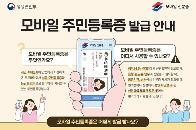 모바일 주민등록증은 실물 주민등록증과 동일한 법적 효력을 가지며, 개인 휴대전화에 안전하게 저장해 편리하게 사용할 수 있는 디지털 신분증이다.