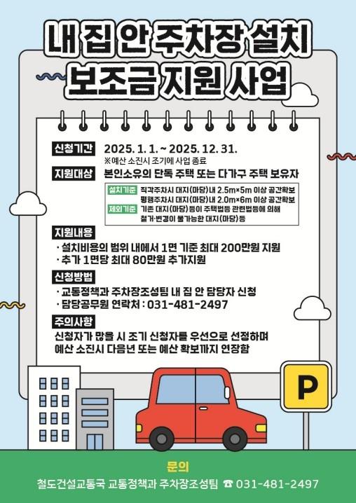 참여를 원하는 주택 소유자는 공사를 시작하기 전에 안산시 교통정책과(031-481-2497)로 신청해야 한다. 이후 담당자가 현장을 방문해 보조금 지원 가능 여부를 확인한다. 대상자로 선정돼 주차장을 설치하면 향후 5년간 주차장을 유지해야 한다. 예산이 소진되면 사업은 조기에 종료된다.