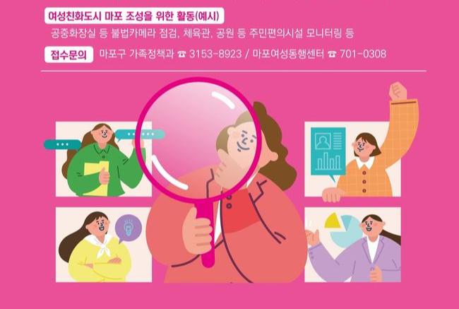 모집 대상은 마포구에 거주하거나 직장(사업장)을 둔 만 18세 이상인 자로 여성친화도시 정책과 사업에 관심이 있고 지속적인 활동할 수 있어야 한다.