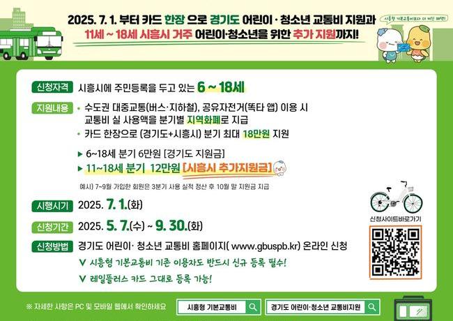 기존에는 2021년 10월부터 7∼18세를 대상으로 시행한 `시흥형 어린이·청소년 기본교통비 지원사업`과 2024년 5월부터 6∼18세를 대상으로 시행한 `경기도 청소년 교통비 지원사업`이 별도로 운영돼 왔다. 시는 대상과 운영 방식이 유사한 두 사업을 통합해 행정 효율성과 시민 편의성을 높이고 실질적인 지원 효과를 강화한다는 방침이다.