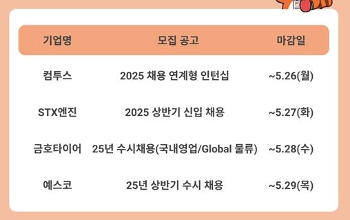 ‘상반기 막바지 채용 기회’…인크루트, 5월 인턴 및 신입 공고 소개 - 컴투스·STX엔진·금호타이어·예스코 등 주요 기업 채용 진행 중 - 졸업예정자 및 기졸업자 대상…전문분야 중심 채용 활발 - 인턴십부터 수시채용까지…정규직 연계 기회 제공