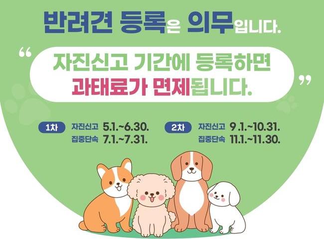 구는 자발적인 동물등록을 독려하고자 자진신고 기간을 운영하며, 이 기간에 신규 등록이나 변경 신고를 하면 과태료를 한시적으로 면제할 방침이다.
