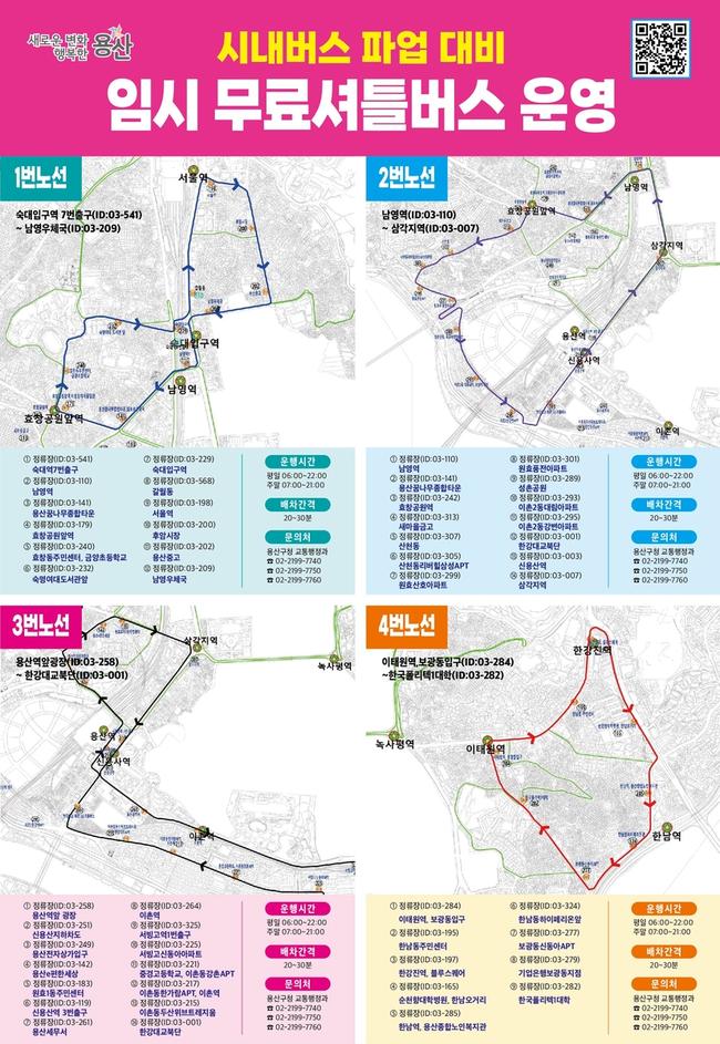 용산구는 정확한 운행시간과 임시정류소 위치 등 세부 정보는 QR코드를 활용해 홈페이지, 블로그, 알림톡, 문자메시지 등을 통해 실시간 안내할 계획이다. 주요 아파트 단지에는 안내방송을 송출하고, 정류소에는 안내문과 노선 홍보물을 부착해 주민들의 혼선을 줄일 방침이다.