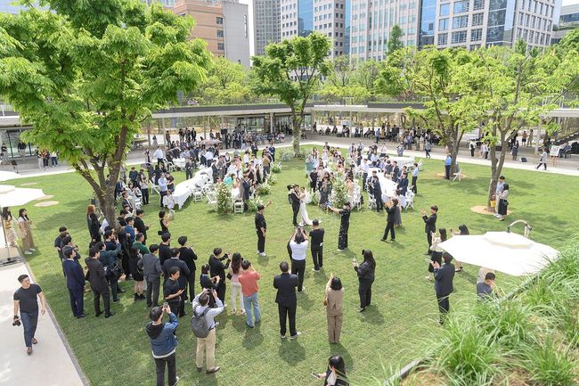 2024년 4월, 오목공원에서 열린 야외결혼식 전경.양천구(구청장 이기재)는 최근 급증하는 결혼 준비 비용 부담을 완화하고, 건강한 결혼 문화를 조성하기 위해 오목공원 내 회랑과 중앙정원을 예비부부를 위한 공공예식장으로 운영하고 있다. 특히 스튜디오, 드레스, 메이크업 비용 등을 줄이고 싶은 청년층을 중심으로 높은 관심이 예상된다.