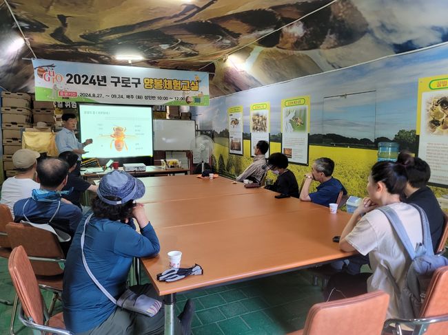 구로구 양봉체험교실에서 참가자들이 꿀벌의 생태와 양봉 과정을 학습하고 있다.