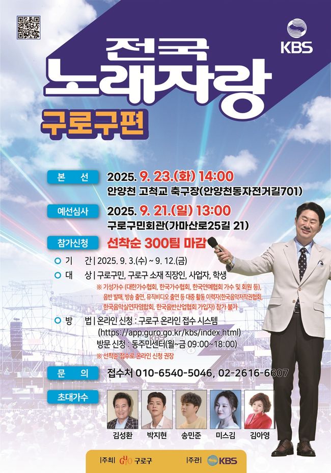 장인홍 구로구청장은 “전국노래자랑 구로구편이 구민들의 일상에 활력을 더하고 지역사회에 즐거운 에너지가 퍼지는 계기가 되길 바란다”며 “많은 구민들이 함께 즐기고 참여하길 기대한다”고 말했다.