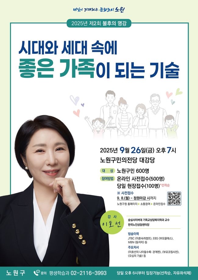 오승록 노원구청장은 “이번 강연이 세대와 관계 변화 속에서 가족의 의미를 돌아보는 시간이 되길 바란다”며 “앞으로도 불후의 명강을 통해 구민이 함께 성장하는 배움의 장을 지속적으로 열어가겠다”고 말했다.