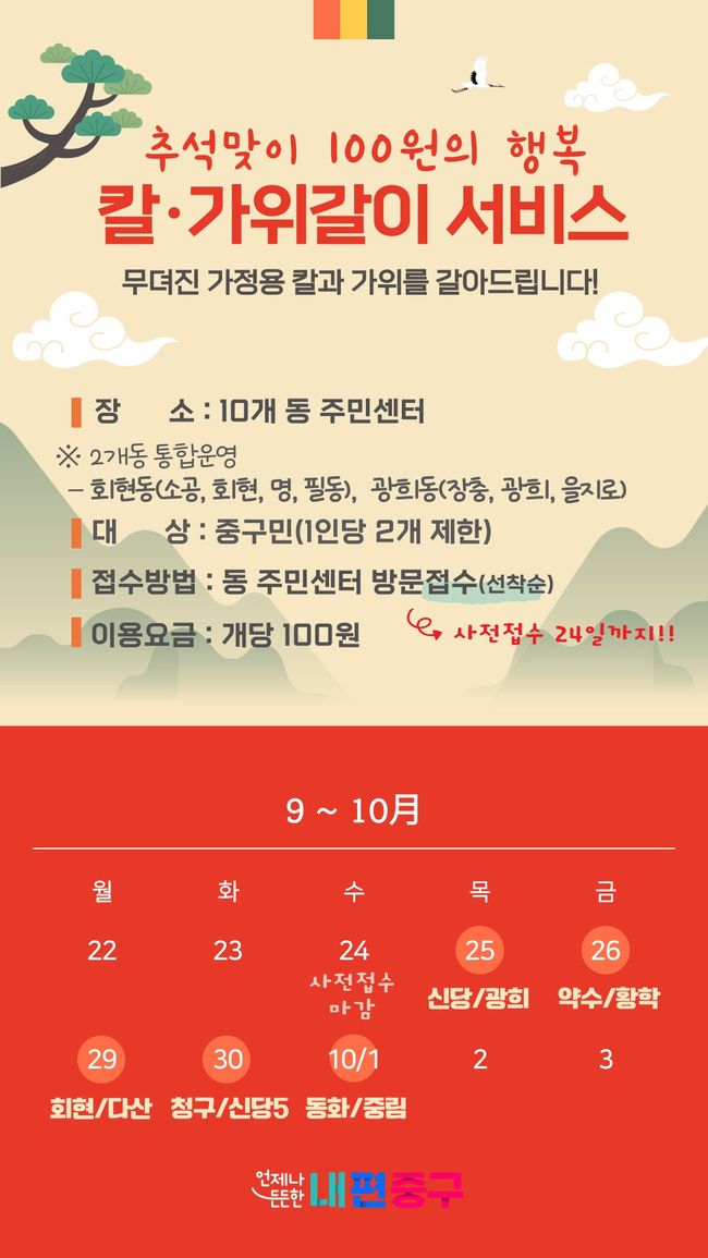 중구, 추석맞이 ‘100원 칼·가위갈이 서비스’ 운영 - 9월 25일~10월 1일, 동 순회하며 생활밀착형 지원 - 주민센터 신청 후 방문…최대 2자루까지 가능 - 배달서비스·캘리그라피 이벤트 등 주민 맞춤형 편의 제공