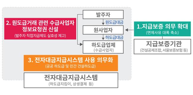 세 번째로 하도급대금 중간 유용을 차단하기 위해 공공 하도급거래와 민간 건설하도급거래에 전자대금지급시스템 사용을 단계적으로 의무화한다. 이 시스템은 발주자가 원사업자와 수급사업자 몫을 구분해 지급해 원사업자가 타인의 몫을 임의로 사용하는 것을 원천적으로 차단하는 방식이다.