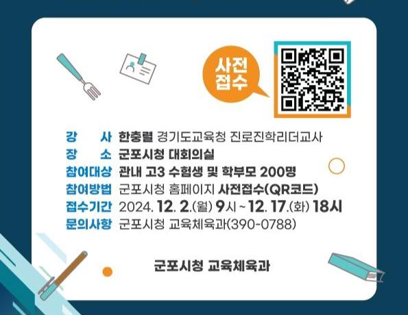이번 달 20일 오후 7시부터 군포시청 2층 대회의실에서 개최되는 입시전략 설명회에서는 한충렬 경기도 진로진학 리더교사(부천 송내고 교사)가 2025학년도 정시 대비 입시전략을 설명할 예정이다.